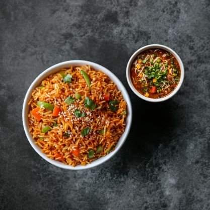 Flavorful Indo-Chinese dish featuring a mix of fried rice, noodles, and Schezwan sauce. Topped with spicy Schezwan gravy and crispy fried noodles.
